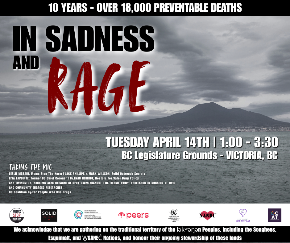 Join us Tuesday April 14th from 1:00 – 3:30 at the BC Legislature Grounds, in Victoria BC. Rally to Rage, Grieve and Remember.